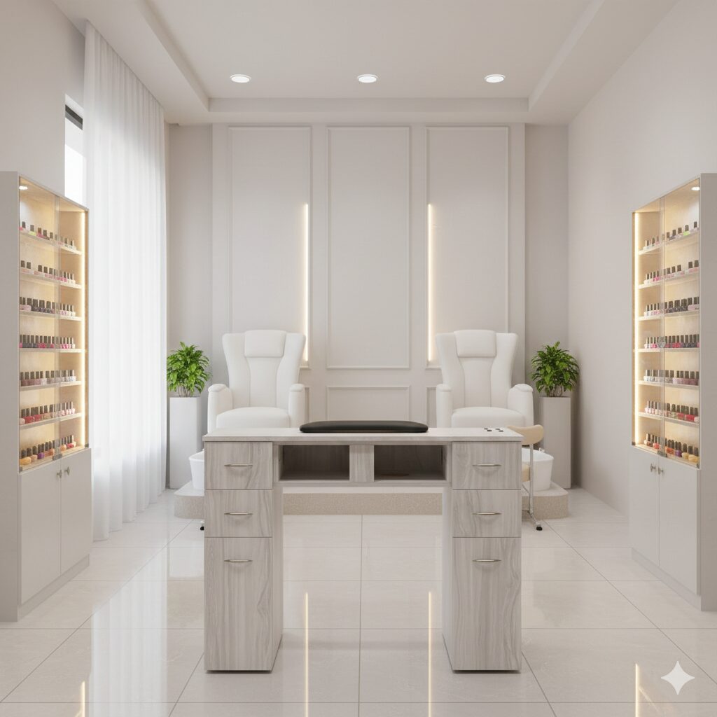 Modern Gray/Gold Nail Table – Style, Function, and Efficiency in One